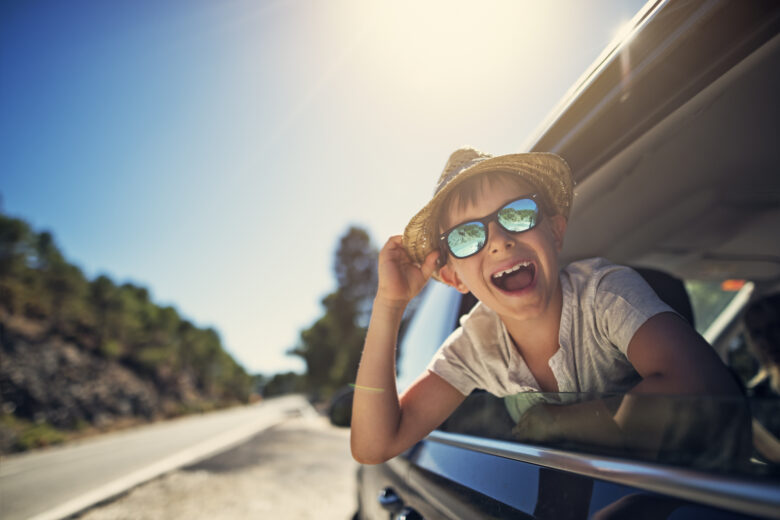 Verso un futuro più felice Little boy aged 8 is looking out of the car window. Sunny summer day in Tuscany, Italy.
